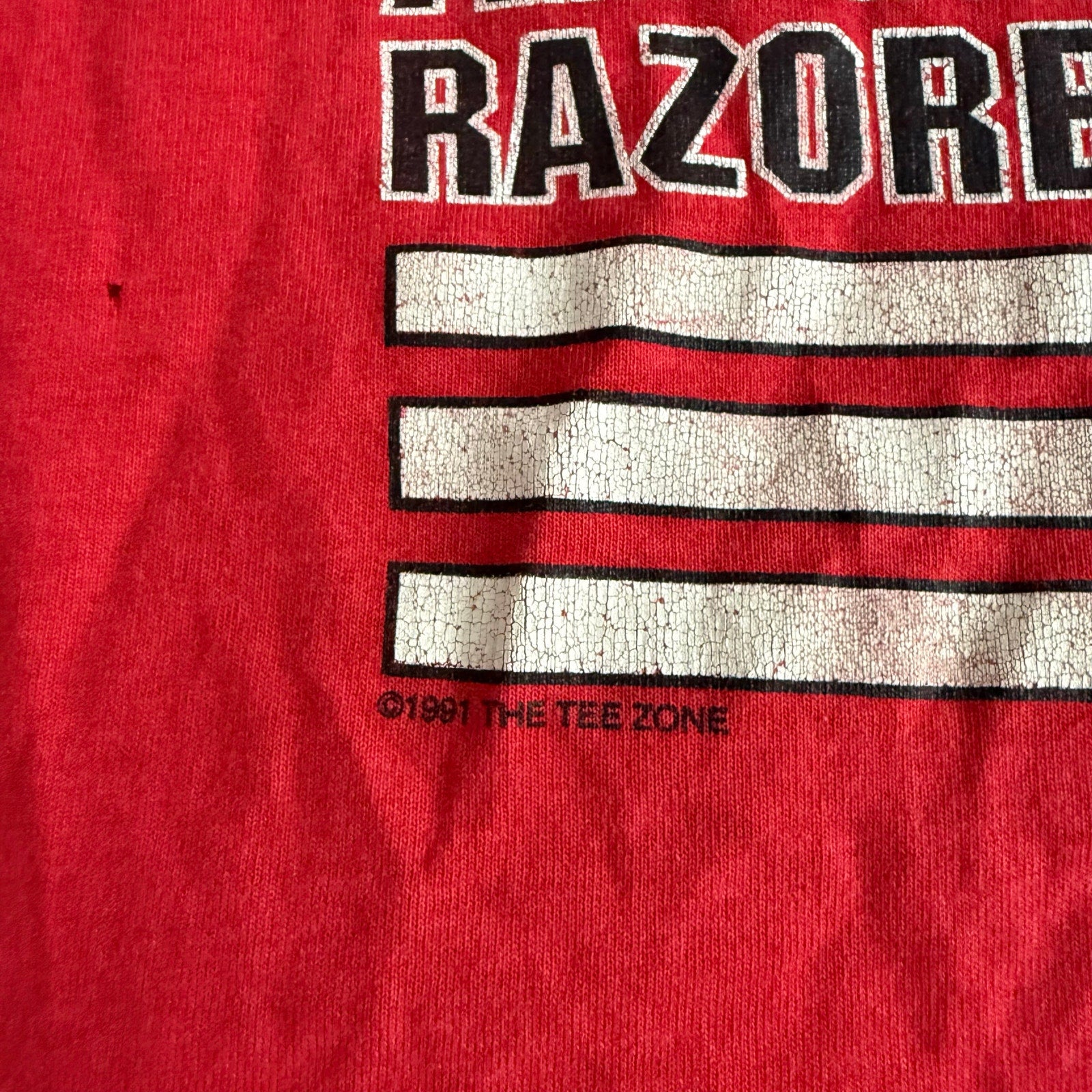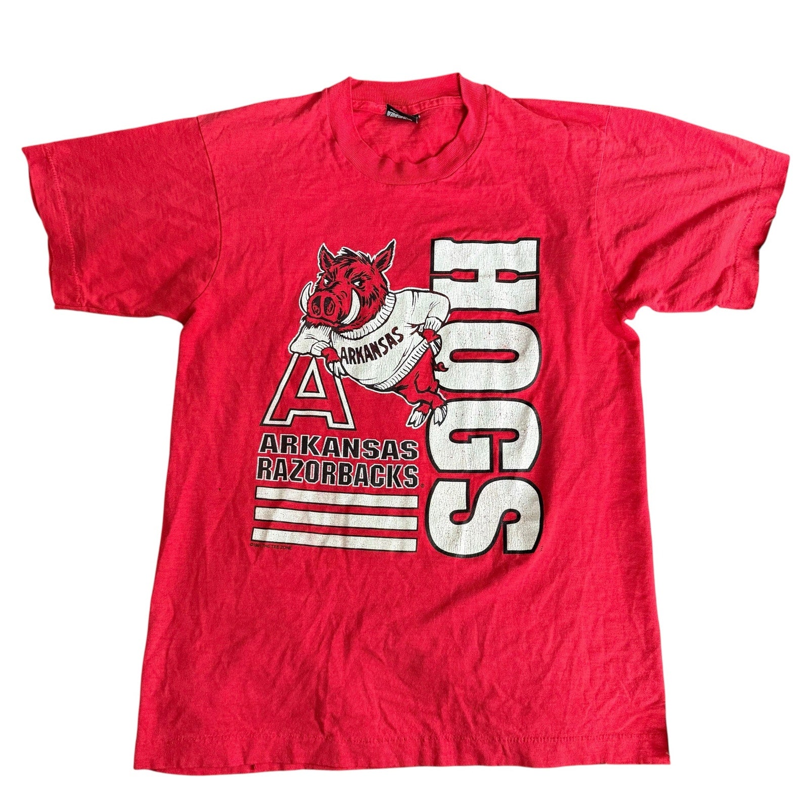 Get ready to show off your Razorbacks pride with this awesome vintage graphic T-shirt! This shirt is in great condition and features a cool, classic design that any fan would love. Perfect for game days, casual outings, or just lounging around. Don't miss out on adding this unique piece to your collection!