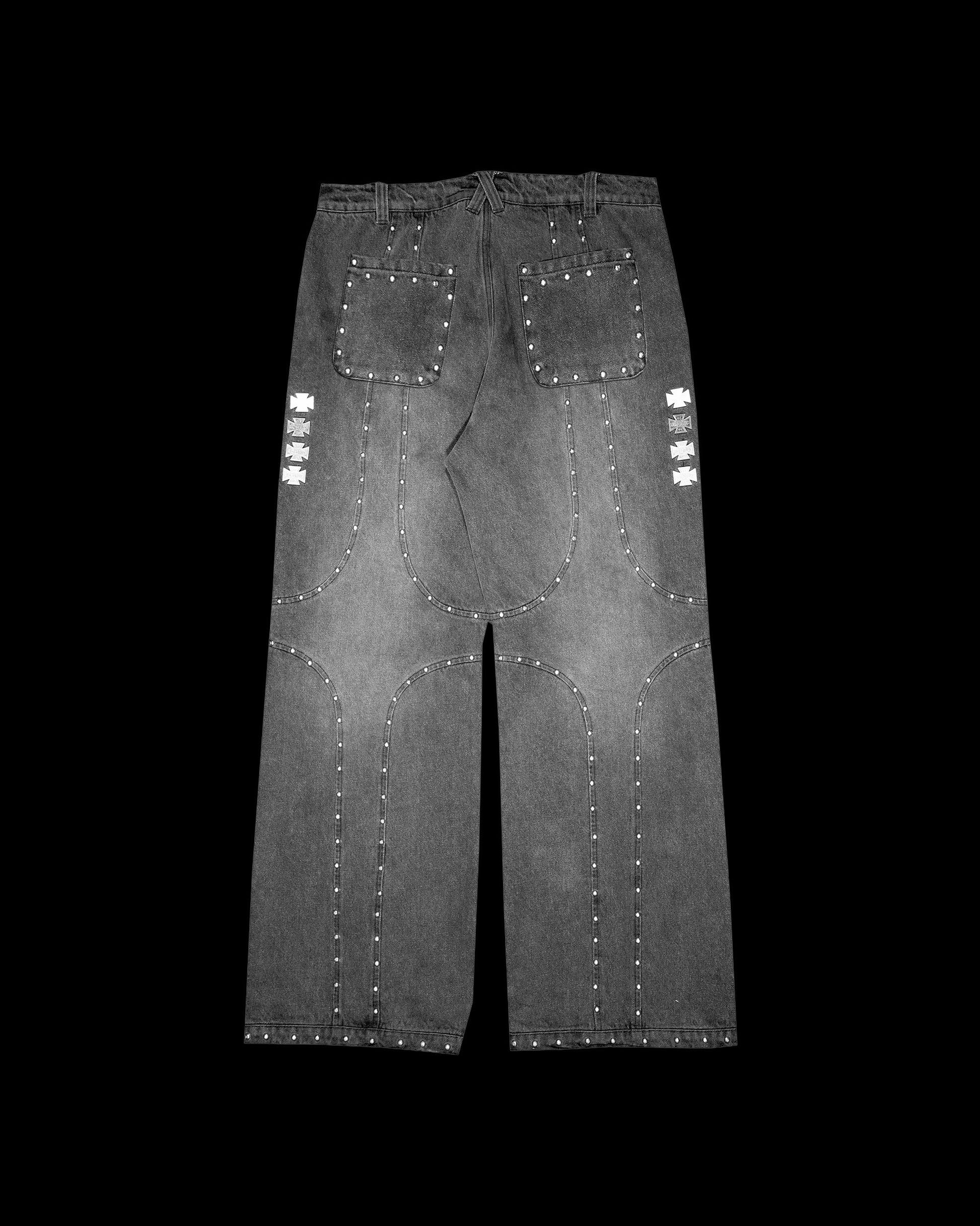 Iconaclub denim jeans with a faded wash featuring custom star pattern pins made to resemble the same Torx "star" screws found in BMW cars of all variations.